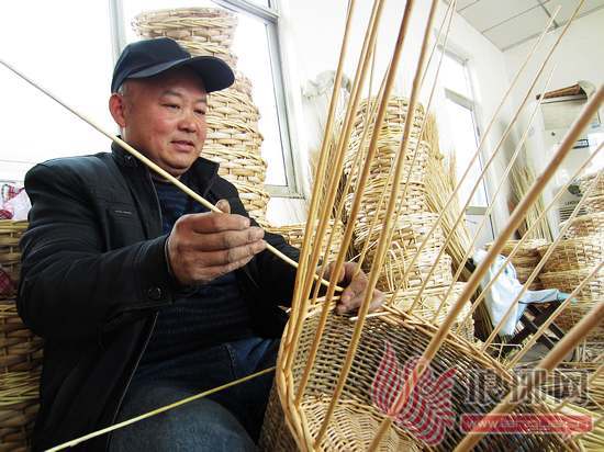 魏秀利是郯城县庙山镇薛庄村人,这位有着30年柳编技艺的老手艺人对于目前这种情况有些无可奈何。用他的话说,今年的生意不景气是十年不遇的,这一行干了这么多年,数今年的活最少了。一个熟练的编织户,一天最多能编十几个筐,往年一天能挣100元,而如今一人一天拼命地编筐,也只能赚到四五十元。