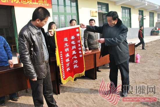 图为该村村支书代表全体村民向河东供电部敬献锦旗。