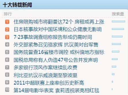 中国网12月27日讯 2011年是不平凡的一年,也是全世界最纠结的一年。回顾即将过去的这一年,“新国八条”、“限购令”、“房产税”,围绕房地产的政策大锤毫不留情地重重砸下;日本“3-11”大地震警告人类《2012》或许不仅仅是个电影;利比亚人民仍在为了幸福进行艰苦卓绝的斗争,美欧国家仍然怀揣着“石油+粮食+货币=全世界”的野心……在互联网的推动下,各种热点新闻你方唱罢我登场,其切换速度之快、波及范围之广、引起争议之多,达到前所未有的程度。今天,中国网财经和百度新闻合作推出2011年度十大新闻转载榜,这份堪称中国网络媒体风向标的榜单显示,继2010年房产新闻夺得转载榜首位后,今年房产新闻继续发力,再度成为媒体的宠儿,在十大转载新闻中占据两席,并再夺榜首。