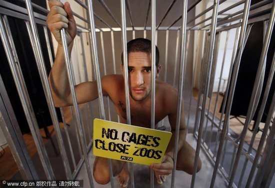 2011年5月18日,印度孟买,著名南非籍板球运动员韦恩-帕内尔在当地被裸体“关进”一个铁笼并拍摄照片,藉此倡导全球动物园善待动物。