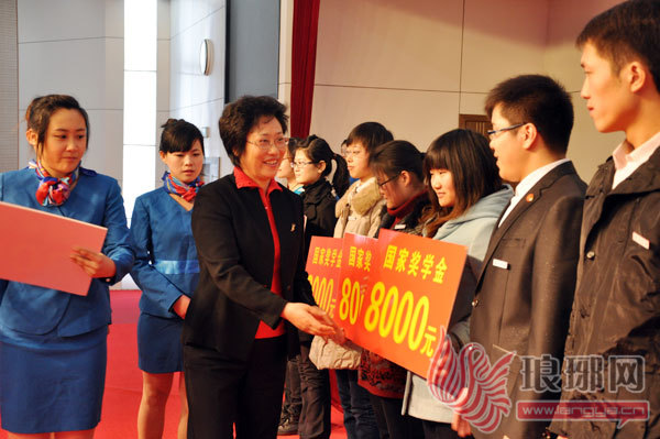 临沂大学党委书记丁凤云向获奖学生颁发奖学金。