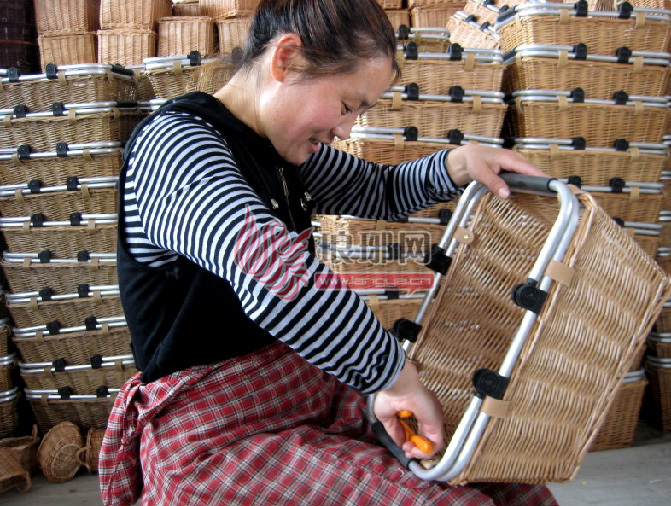 5月18日,临沭县郑山街道晴朗工艺品公司工人在对获得专利权的“新型铝合金提手柳编筐”进行加工制作。