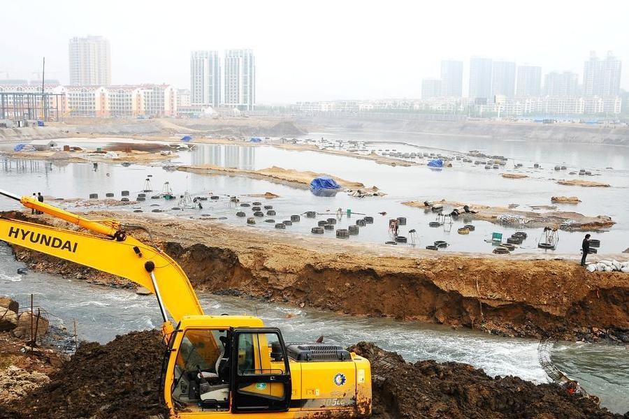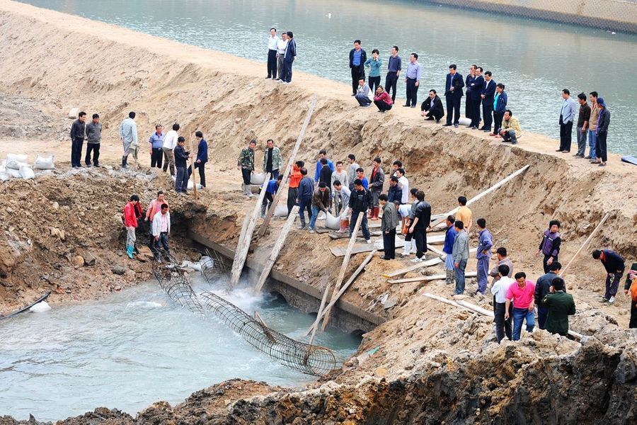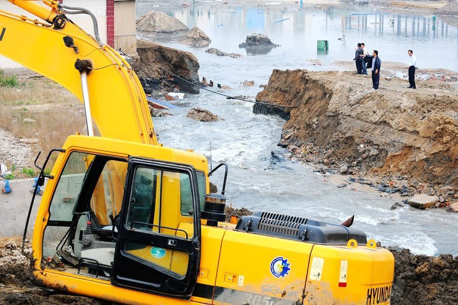 2011年5月19日上午8时许,山东胶南一工地建筑工人因海水倒灌形成一片泽国。 当日清晨6时许,山东省胶南市积米崖港区的青岛太平洋梦时代广场建设工地,因涨潮发生海水倒灌事件,现场无人员伤亡。经警民合力于上午11时,将缺口堵住,经济损失估计高达千万元。 版权图片,请勿转载