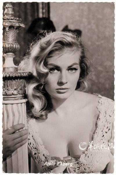 安妮塔·艾克伯格曾与玛丽莲·梦露、索菲娅·罗兰齐名,还曾一度被誉为是“地球上最性感的女人”。安妮塔1931年出生于瑞典,金发碧眼的她在19岁时当选为“瑞典小姐”。安妮塔后来到美国参加“环球小姐”竞选,虽然她没有夺冠,但仍和美国“环球工作室”签下合同,从此走上美国影坛,拍下了多部脍炙人口的影片,包括《艺术家与模特》、《战争与和平》、《墓穴中的男人》、《血巷》、《巴黎假日》等。