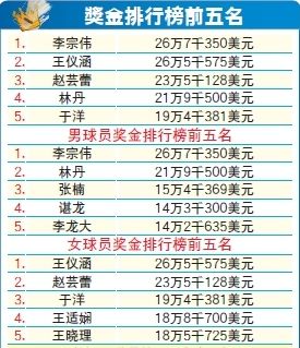 中国球员在男女球员奖金排行榜前5位中占了4席,王仪涵以26万5千575美元屈居第二位,第三至第五依次是赵芸蕾、林丹以及于洋。