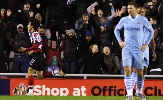 不过遗憾的是,曼城的联赛不败纪录于将近一个月前葬送在了斯坦福桥,状态并不算突出切尔西(微博)人的脚下。如果说这一场比赛的失利还算情有可原的话,那么今夜,曼苏尔酋长拆资数亿英镑打造的这支王牌之师,败在了积分榜中下游球队“黑猫”桑德兰的脚下,则完全可以说是令人大跌眼镜儿了,当然,这一切都要归功于一个来自东亚的90后小伙子——池东沅!