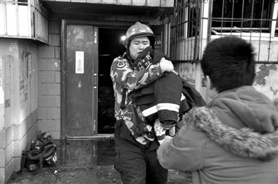 “他家的门反锁了,我们都把门环弄掉了,也没打开门。”参与搜救的消防员只能使劲敲门,让屋里的老人穿过客厅,打开房门。随即,老人和孩子被救出来。