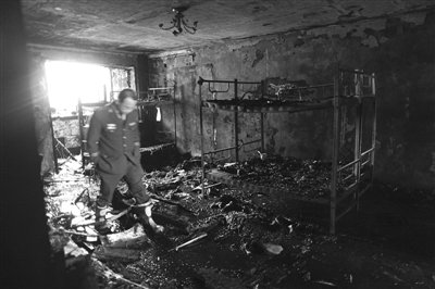 消防人员在起火后的现场勘查。本报记者 浦峰 摄