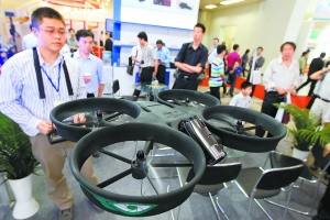 昨天,在北京展览馆的展厅里,一位参展商现场操控四旋无人侦察机。摄影:本报记者 饶强