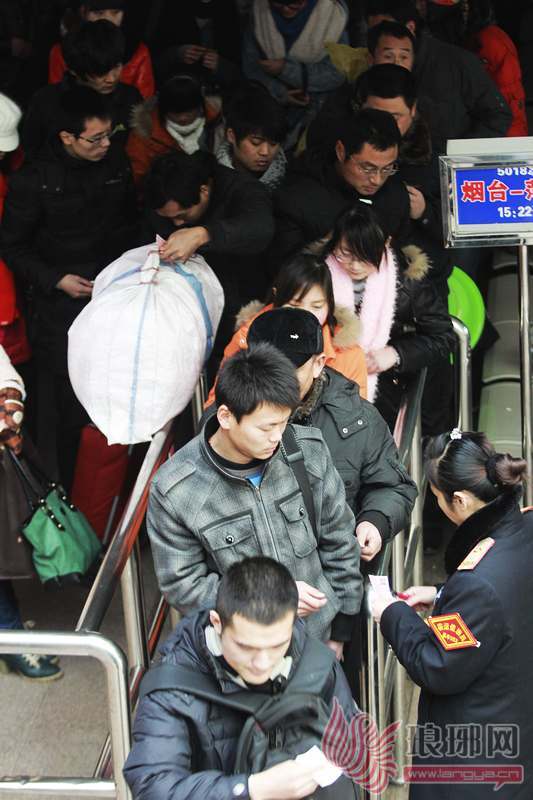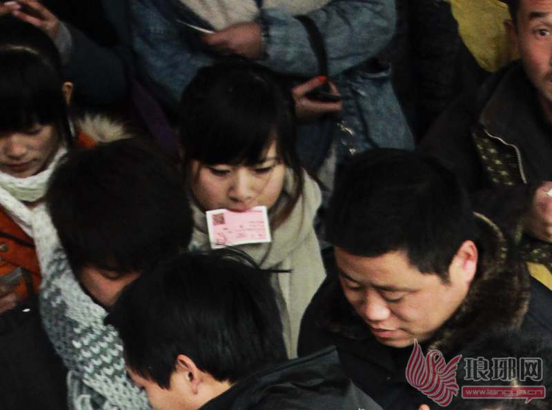 1月3日,在临沂市火车站,一位等待检票的旅客由于两手拿的行李太多,只能将火车票含在嘴中。