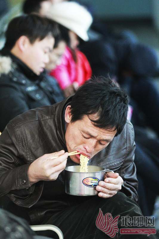 1:1月3日下午2时许,在临沂火车站候车大厅,一位等待上车的乘客紧张的吃着方便面。