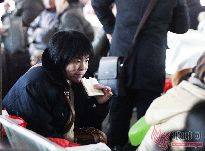 1月3日下午2时许,在临沂火车站候车厅内,一位乘客赶在上车前紧张的吃着午饭。