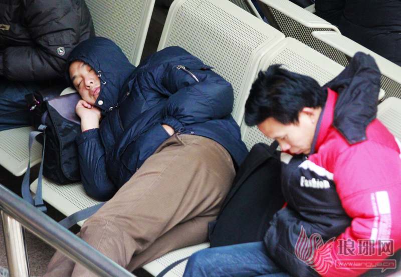 1月3日,在临沂市火车站候车大厅,两位等待上车的旅客疲惫的躺在座椅上打盹。