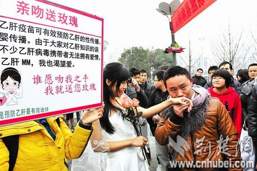 楚天金报讯 记者饶纯武、刘蔚丹、肖清清 实习生张衡报道:谁愿吻我之手,我就送您玫瑰。昨日,武昌光谷广场上,一名乙肝女孩举起“亲吻送玫瑰”的宣传牌,10朵象征爱情的玫瑰半小时就全部送出。