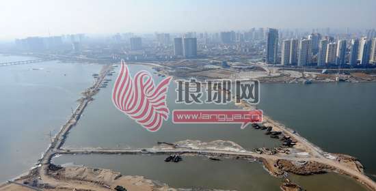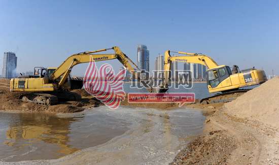 4日我市气温跌至入冬以来的最低点,三河口隧道施工现场已建起的围堰边缘结起了厚厚冰层,工人们则穿着棉衣在寒风中紧张地施工。在东西两侧的围堰上,挖掘机和推土机正在最后的缺口处将沙土送入湍急的水流中,10点整,东侧的围堰实现合龙,10点40分,西侧围堰宣告合龙,现场传来庆祝的鞭炮声。远远望去,长度达到2.6公里的围堰,在三河交汇处的水面上围起了巨大的区域,区域内的水面上各种施工船只正在作业,蔚为壮观。