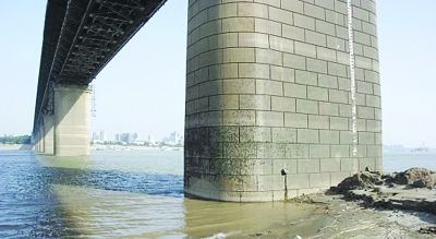 5月17日,武汉长江大桥桥墩下的水位线已“露底”。中 新