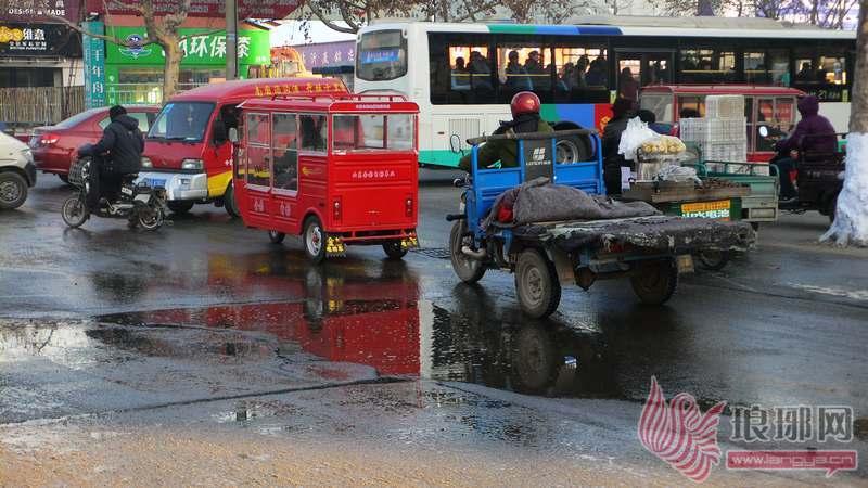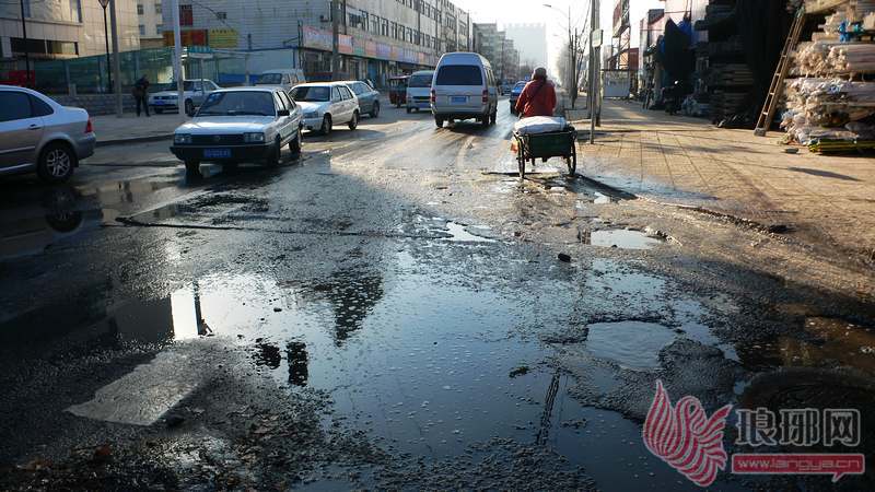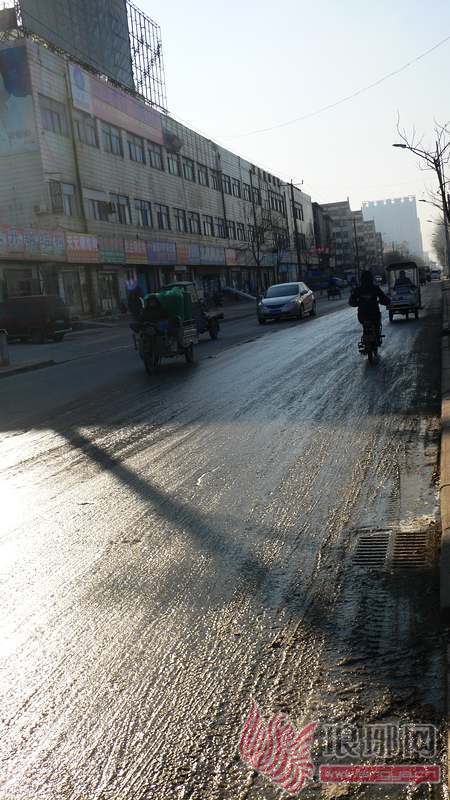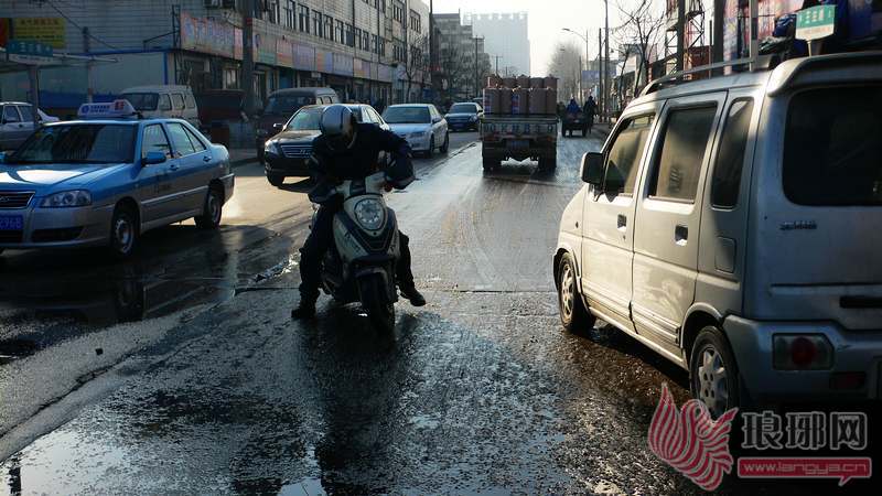 当日上午,记者在王庄路与解放路交会处看到,漏水处附近的路面已经下沉了10多厘米,附近的积水非常严重。同时,由于该路口来往的车辆非常多,路口往南近百米的道路上已经结起了一层冰。记者在现场观察的几分钟内,就有4位骑车市民险些摔倒。
