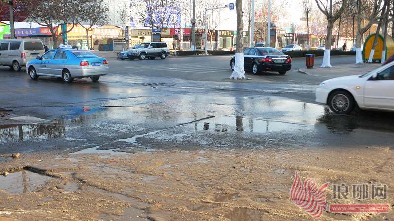 2011年12月3日报道了王庄路与解放路交会处自备井管道破裂造成路口严重积水一事。如今一个月的时间过去了,但漏水处却一直无人修理。1月4日上午,记者再次来到该路口看到,附近的积水已经结成冰,有许多骑车的市民因此而滑倒。