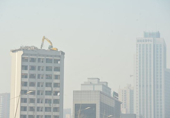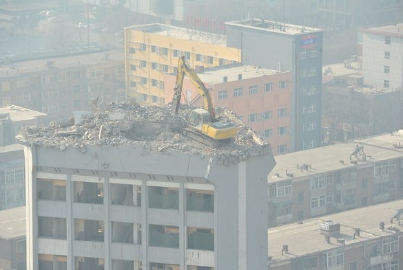 2012年1月5日,山西省太原市万柏林区迎泽西大街,山西科技大厦宾馆顶层,一台挖掘机在楼顶上作业。令周围市民既惊奇又担忧。