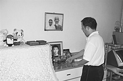 去年8月3日,药庆卫在西安的家中,桌上摆放着自己儿子药家鑫的遗像。资料图片 孔璞 摄