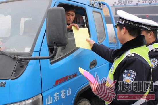 1月5日上午,临沂高速交警在京沪高速公路临沂站口设立的春运交通安全检查站前,对一辆过往临沂境内的烟台客运车和货车驾驶人发放交通安全宣传材料并进行登记检查。
