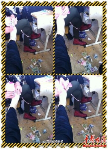 图片显示,一名女学生正坐在教室的座位上,给从旁边座位上伸出的一只脚用钱擦鞋,地面上有多张1元、5元、10元、100元金额不等的纸币。