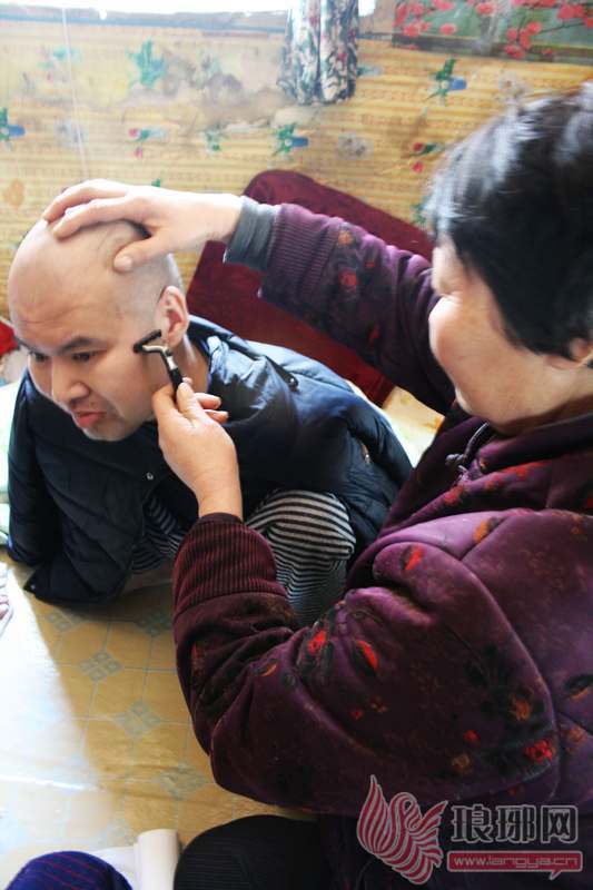 母亲孙运霞给儿子薛秀军刮胡子。