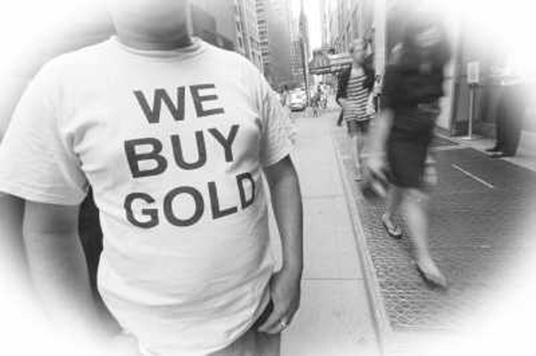 2011年7月18日一名男子身穿印有“我们买黄金”字样的T恤站在美国纽约曼哈顿的街道上。受到投资者对美元波动担忧,纽约商品交易所黄金期货价格当天连续第10个交易日维持涨势并冲破1600美元大关。新华社发