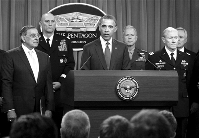 5日,奥巴马(中)在五角大楼宣布美国新军事战略。