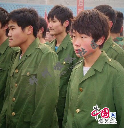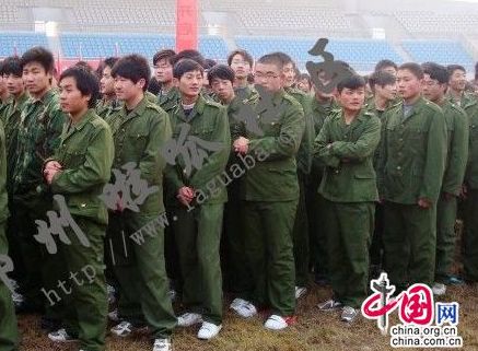 身着夏天军训外套的孩子们在腊月寒冬中瑟瑟发抖