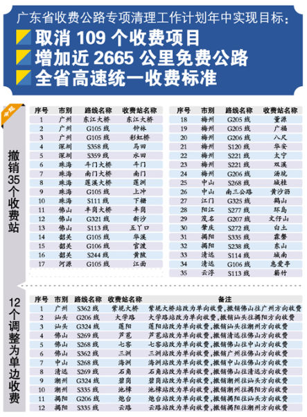 13个政府还贷公路项目取消收费,黄埔港新沙港区第一期工程撤销东江大桥收费站、国道105线番禺大石至陈村桥头段撤销钟林收费站。