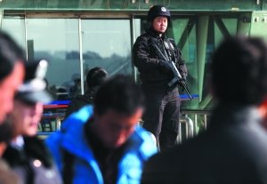 持枪特警在南京火车站候车室门口严密监控来往人流。