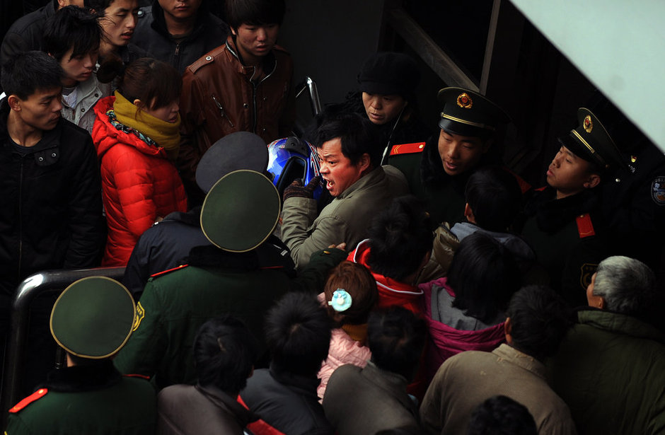 2012年01月08日,浙江省嘉兴市。一农民工由于回家心切、一时没到返乡车票,在火车站春运售票处与一保安发生小摩擦。当日,2012春运正式启动。