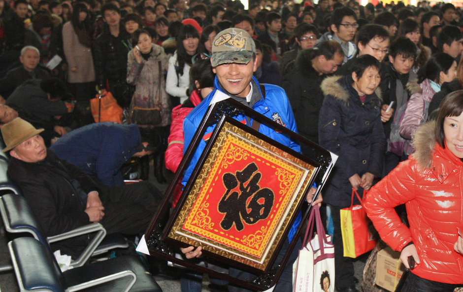 2012年01月08日,湖北省武汉市,当日下午,在武昌火车站,从上海打工准备返回家乡赤壁市的卢先生,带着他购买的“福”字排队乘车。