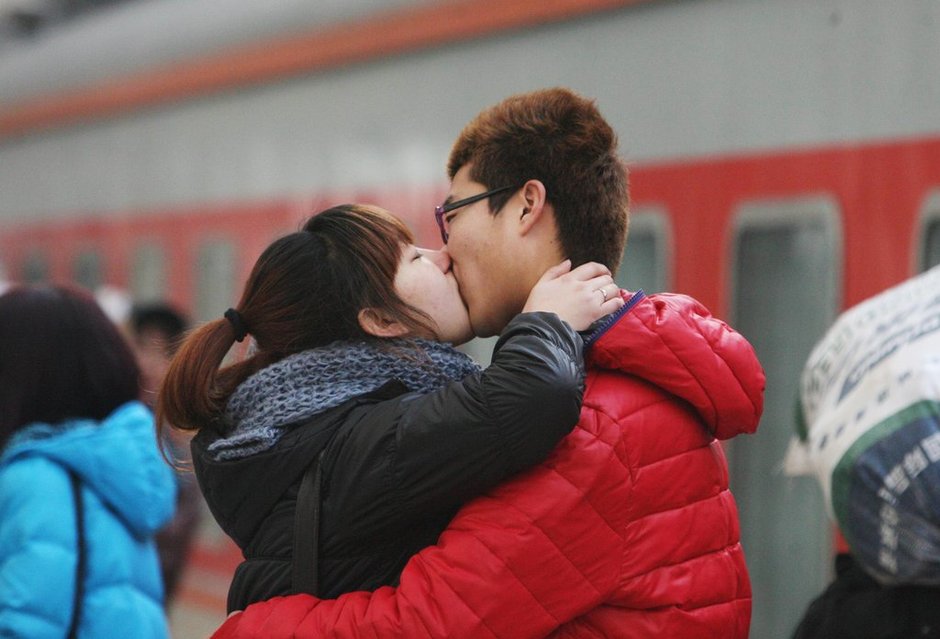 2012年01月08日,山东省青岛市,一对对情侣在车站话离别。