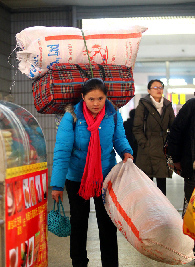 2012年1月8日,上海,一民工乐呵呵地走向回家的列车