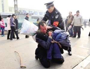 1月8日,山西太原火车站,一位没有身份证的老农滞留车站广场,一民警帮他办理临时身份证、购票,老农才顺利上车。图为老农跪谢民警,民警帮老人扛好行李。