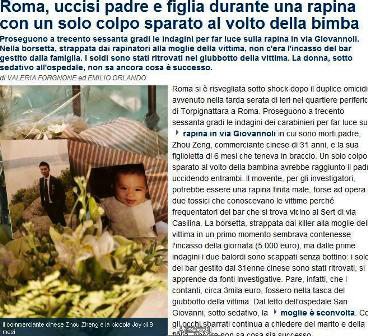 当地时间1月4日晚9时,发生在罗马街头的一起暴力抢劫血腥命案中,受害人周拯(音译)一家三口在下班途中遭遇两名年轻疑犯抢劫,疑犯掏枪向3人射击。受害人周拯胸部饮弹当场身亡,周拯怀中小女儿被子弹击中头部,在送往医院途中不治。周拯的妻子郑丽艳在劫案中中枪受伤,被送往医院抢救。