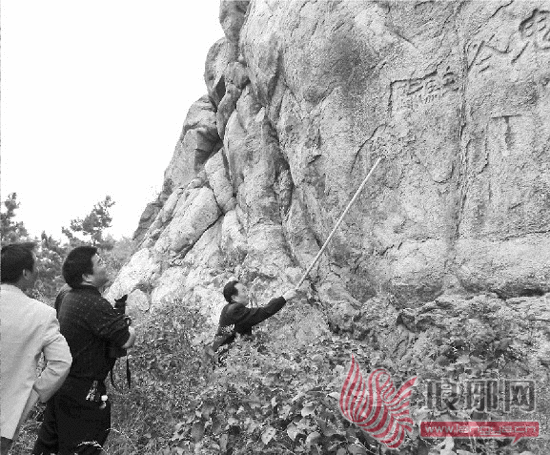 几次去苍马山都没有发现“鬼谷驻迹”在什么地方,去年夏天,我想去寻找那个神秘的处所,临沭县旅游局原局长王明善告诉我,他很多年前就听老人说苍马山上有鬼谷子讲学的场所,而且上面的山体上有古人刻下的大字,他将信将疑去寻找,他在山上寻找了好多年都没能如愿,一直到十年前他才如愿以偿。王局长在临沭有“活字典”之称,他很长时间没有找到,这说明现在的临沭人,也未必知道还有这样一处古迹在苍马山上。
