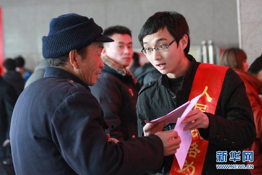 1月11日,在威海火车站,张平(右)在返乡前向人们发放自己印制的电话购票流程示意图。