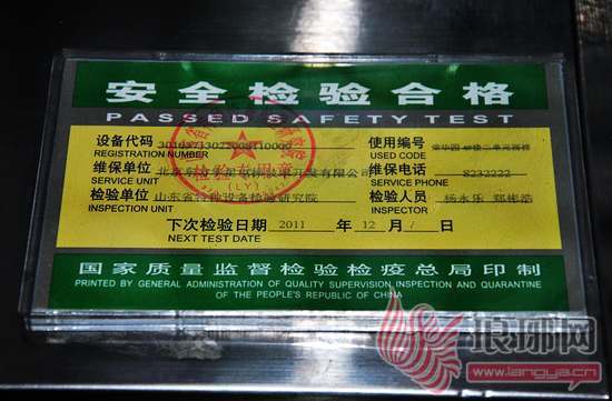 图为荣华园小区电梯内张贴的安检合格证已经过期近俩月。