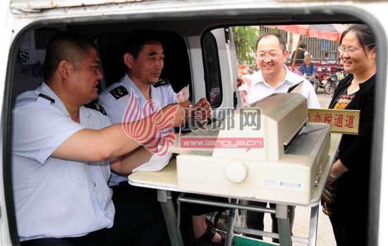 5月20日,郯城县国税局首辆配置有车载“中国税收征管信息系统”的笔记本电脑、票据打印机、无线POS刷卡机等设备的“流动办税服务车”开到了马头镇集贸市场,在纳税人店门口办理征收业务,深受纳税人欢迎。据悉,该局新配备的6辆“流动办税服务车”将重点到偏远乡村开展纳税服务和税法宣传,为纳税人提供税务登记、税款征收、普通发票领购等业务,让纳税人享受个性化的便捷服务。图为郯城县马头国税分局征收人员在“流动办税服务车”里为纳税人办理相关手续。