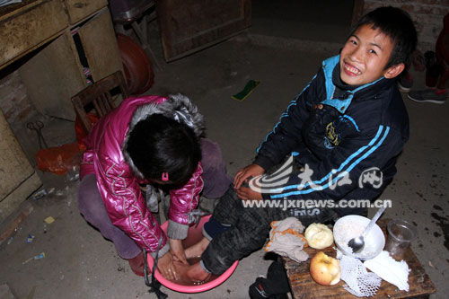 小依萌给哥哥洗脚。