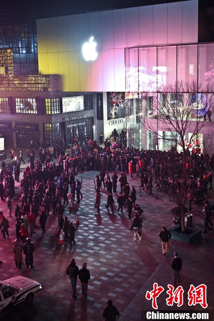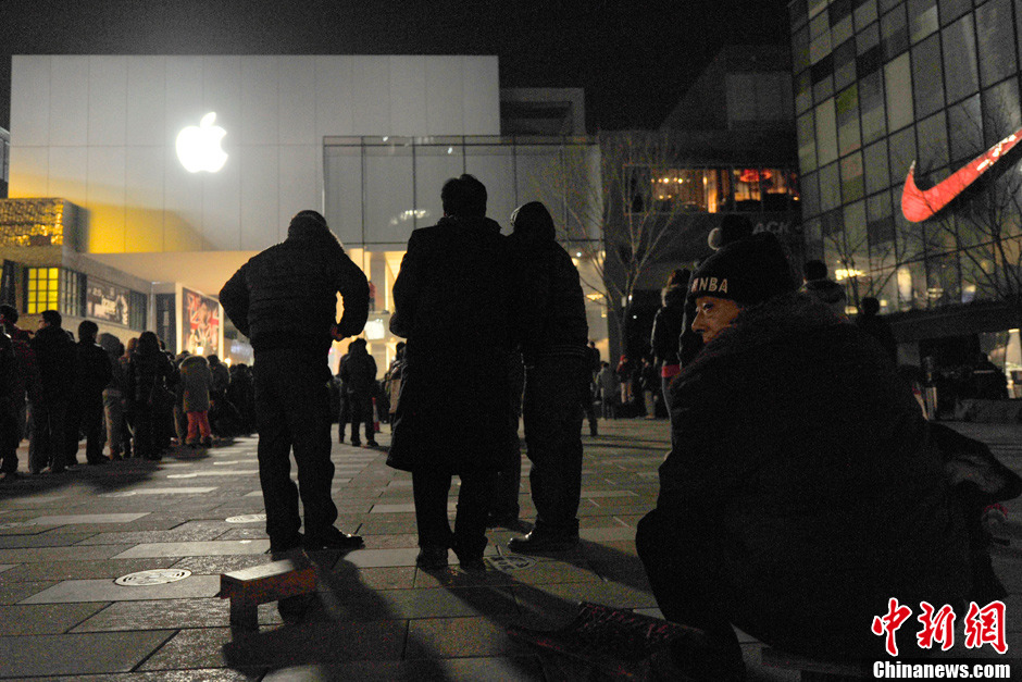 1月13日凌晨,WCDMA版iPhone 4S今日正式在内地开售,大量“果粉”聚集在APPLE STORE(苹果官方零售店)门口彻夜排队等候,也有很多网友通过网络渠道抢购。图为三里屯苹果店前等待购买iPhone 4S的顾客。中新网记者 金硕 摄