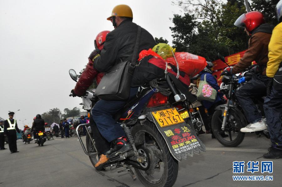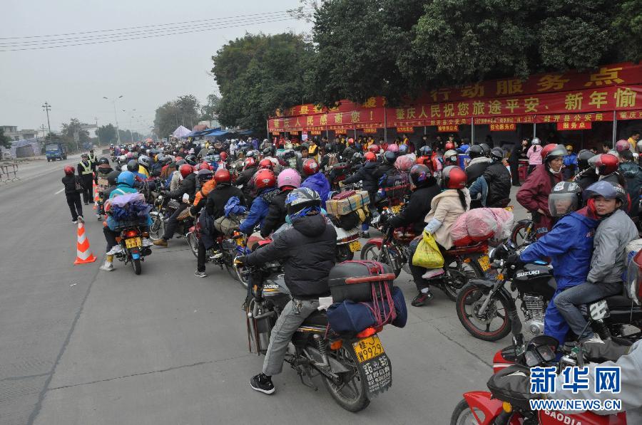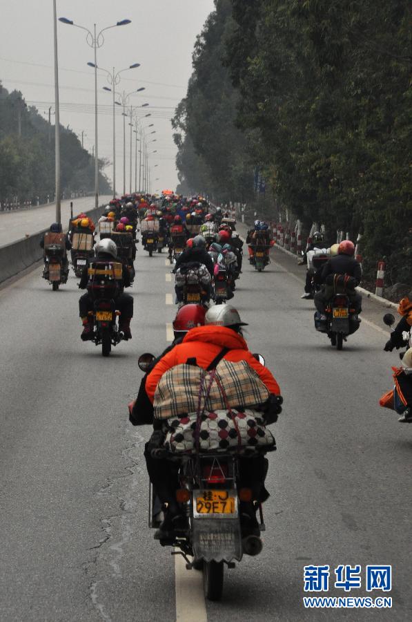 随着广东珠三角工厂春节前相继放假,一批批打工的人们采取骑摩托车的方式返回家乡。他们汇成的“摩托大军”成为春运路上一道别样的风景。 新华社发(何鎏 摄)