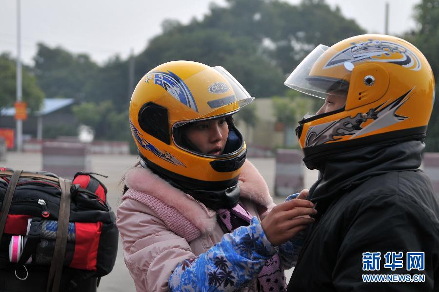 1月11日,在321国道广西广东交界路段,一对驾驶摩托车返乡的夫妻在出发前相互检查头盔护具。 随着广东珠三角工厂春节前相继放假,一批批打工的人们采取骑摩托车的方式返回家乡。他们汇成的“摩托大军”成为春运路上一道别样的风景。 新华社发(何鎏 摄)