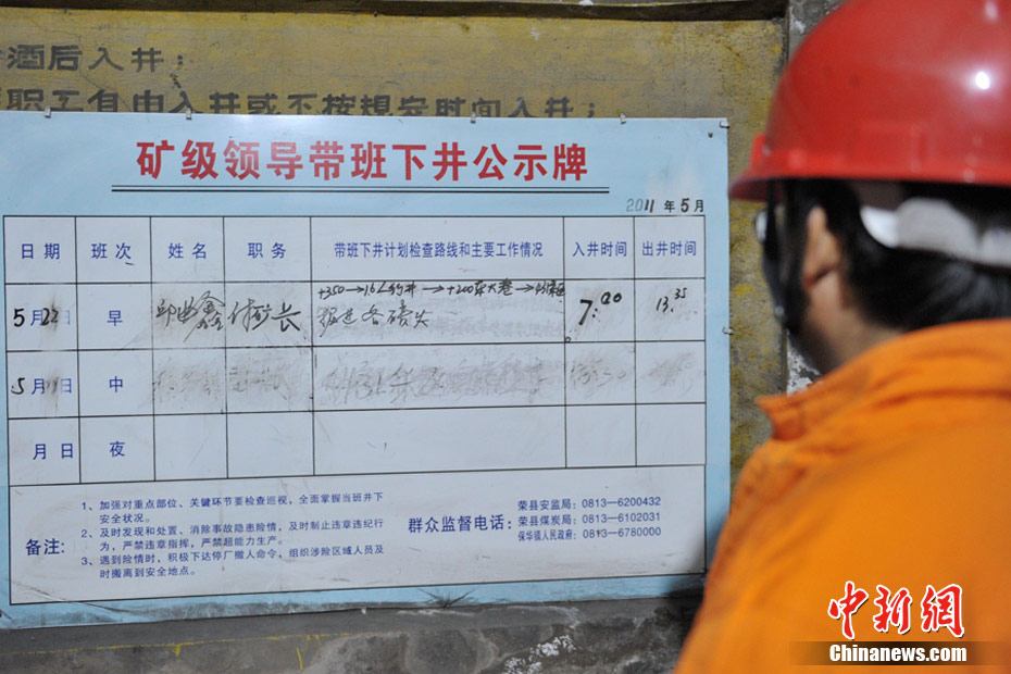 5月22日晚间22时05分,四川荣县新胜煤矿瓦斯爆炸事故救援结束,被困的6名矿工全部遇难。目前,荣县的所有煤矿企业已全部停产整顿,伤者已送到自贡市第四人民医院治疗。图为一位救援人员正在察看矿井公示。中新社发 刘忠俊 摄