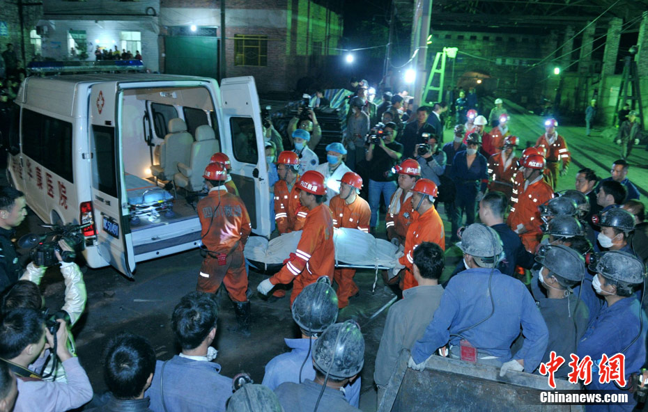 5月22日晚间22时05分,四川荣县新胜煤矿瓦斯爆炸事故救援结束,被困的6名矿工全部遇难。目前,荣县的所有煤矿企业已全部停产整顿,伤者已送到自贡市第四人民医院治疗。图为遇难矿工遗体陆续被抬出井口。中新社发 刘忠俊 摄