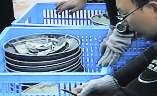 5月22日下午,考古人员整理从海底“南澳1号”明代古沉船发掘出水的瓷器(视频截图)。