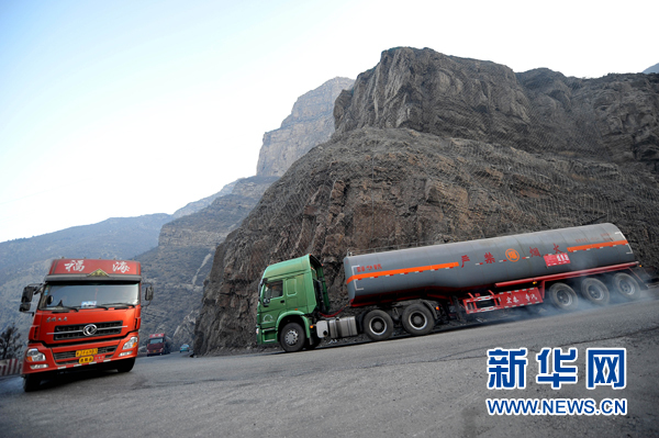 1月13日,在恒山悬空寺风景区,几辆大货车呼啸而过,带起阵阵粉尘。新华社记者 詹彦 摄